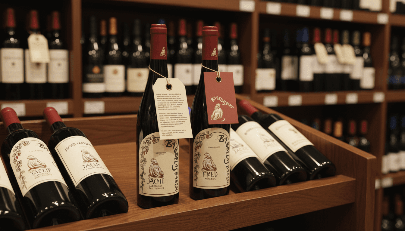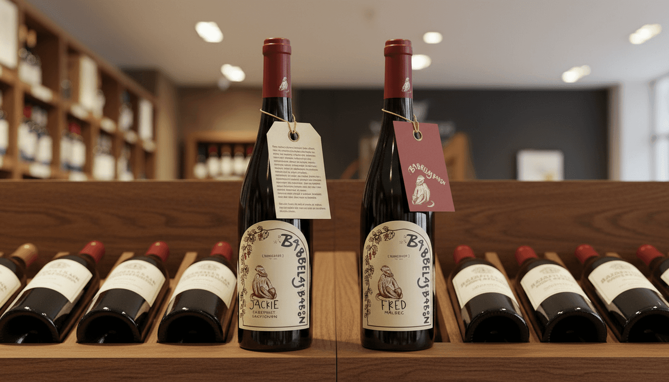 Each wine is linked to a baboon based on shared characteristics. Jackie, the War Baboon, is paired with the Cabernet Sauvignon because they are both bold and powerful; Fred, the Gang Leader, is paired with the Malbec because they are both aggressive and possess deep qualities.